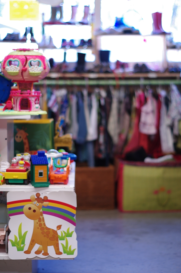 En vous enfonçant un peu plus dans l’allée centrale, le coin puzzles et jeux de société fait face à l’espace enfants : vêtements et chaussures permettent de rhabiller de pied en cap votre cher ange ou votre pré-ado ; de la grenouillère à l’anorak, du legging girly à la veste tricotée main, du vêtement ethnique au blouson rock, du pyjama pilou à la casquette de baseball, de la botte fourrée à la basket hip hop, … tous les styles se donnent rendez-vous ici pour les 0-12 ans.